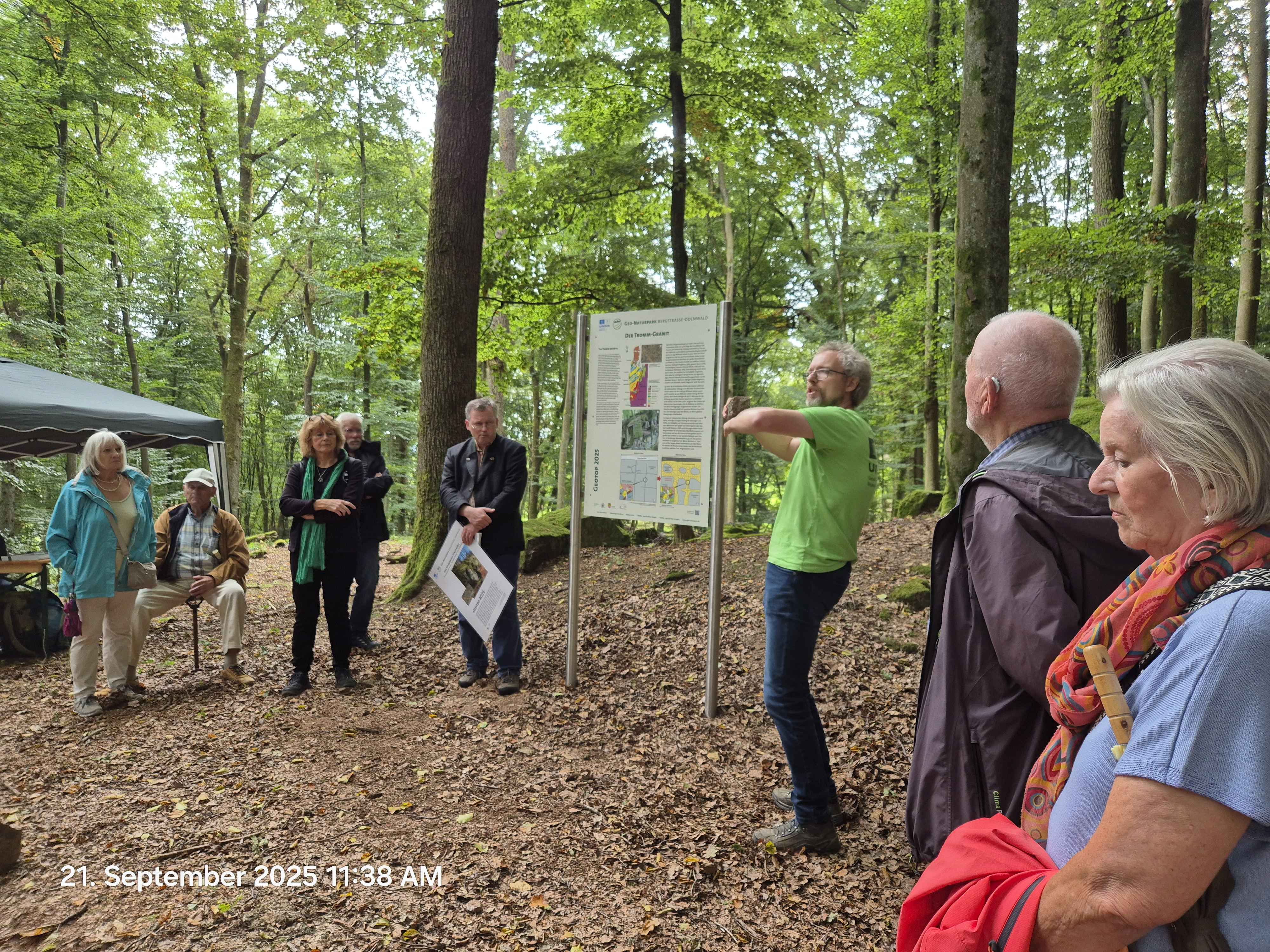 Dass es sich bei dem rötlichen Trommgranit um ein ganz besonderes Gestein handelt, zeigt sich im Steinbruch Streitsdöll eindrücklich. Als herausragendes Fenster in die Erd- und Kulturgeschichte zeichneten Geopark Geschäftsführerin Dr. Jutta Weber und Grasellenbachs Bürgermeister Markus Röth den Steinbruch am 21. September zum Geotop des Jahres 2025 aus. Über 40 Besucherinnen und Besucher lockte das Event am Sonntagmorgen zu dem wunderschönen Kleinod oberhalb von Scharbach.
