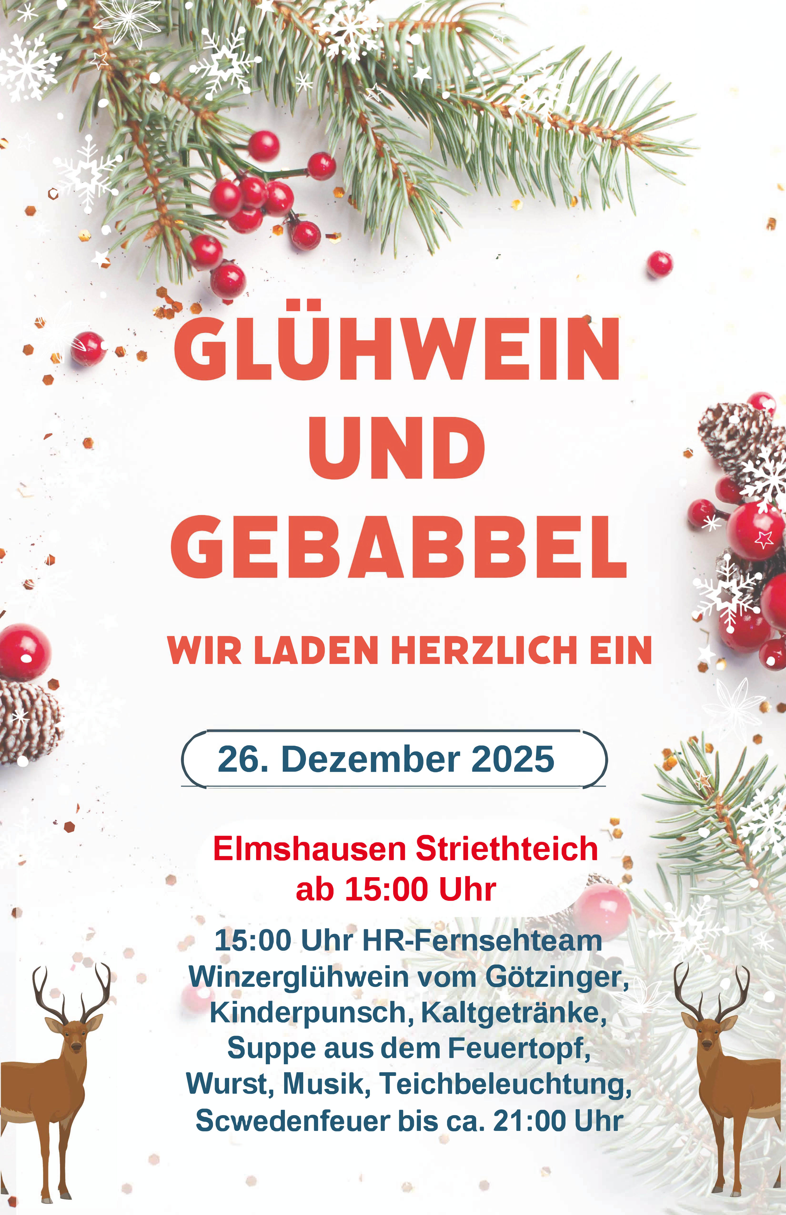 Am 1. Weihnachtsfeiertag wurde in der Hessenschau - wie an einem ganz normalen Donnerstag - das dolle Dorf gezogen, und die Wahl fiel auf Elmshausen! Nun war in dem 1400-Seelen-Dorf Hektik angesagt: am 2. Weihnachtsfeiertag - also "wenn die andern feiern" - mußte eine eindrucksvolle Präsentation erstellt werden. Das HR-Team kam zum Dreh und nahm die interessantesten Plätze im Dorf auf, zusammen mit zahlreichen Einwohnerinnen und Einwohnern. Das war eine Meisterleistung der Dorfbewohner: fast jede Familie hatte Weihnachtsbesuch im Haus, der sich natürlich gern an der Präsentation beteiligte. Das Ergebnis wurde am Samstag 27. Dezember 2025 in der Hessenschau ausgestrahlt: https://www.hessenschau.de/tv-sendung/dolles-dorf-elmshausen,container-beitrag-35650.html