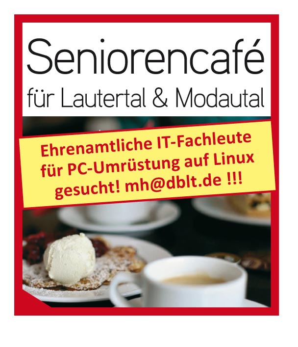 Die Durchblick-Redaktion plant die Organisation eines Seniorencafés mit Schwerpunkt "Computer, Internet, Mobilphone für Senioren". Das Seniorencafé möchte für Modautaler und Lautertaler Seniorinnen und Senioren bei Fragen rund um diese Dinge behilflich sein. Hier können sogar Ihre "alten" Geräte von Windows 10 auf Linux umgestellt werden, inklusive spezieller Softwareinstallationen für Senioren, oder die Einstellungen Ihres Smartphones können nach Ihren Wünschen geändert werden. Geplant sind einerseits allgemeine Hilfetreffen und spezielle Thementreffen sowie Kurse für Einsteiger.