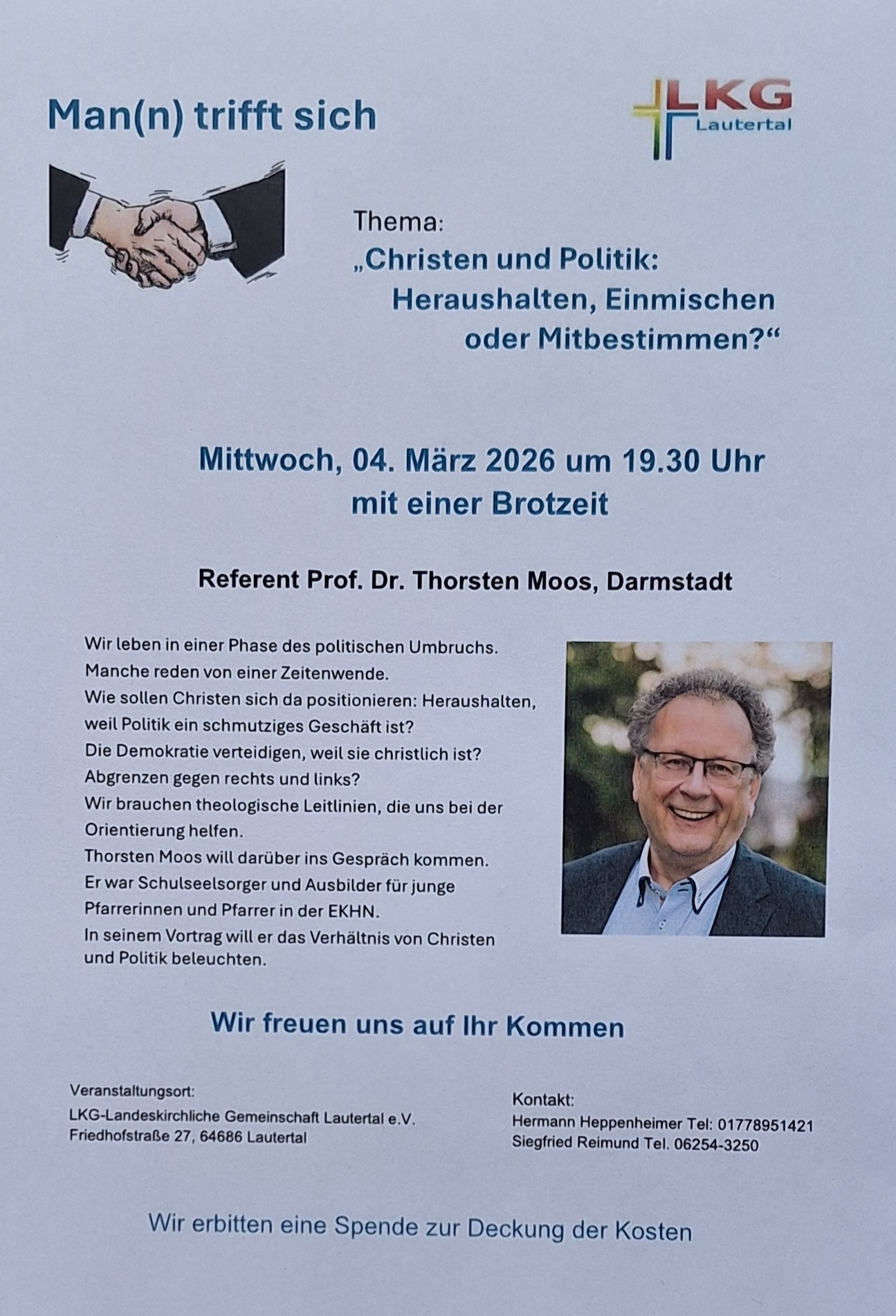Referent ist Prof. Dr. Thorsten Moos aus Darmstadt. Er war Schulseelsorger und Ausbilder für junge Pfarrerinnen und Pfarrer in der EKHN.