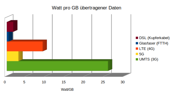 - Mobile Zugangsnetze: 5G-Netz 5 gr, 4G-Mobilfunknetz LTE 13 gr, 3G-Netz UMTS 90 gr CO2 Emission pro Stunde