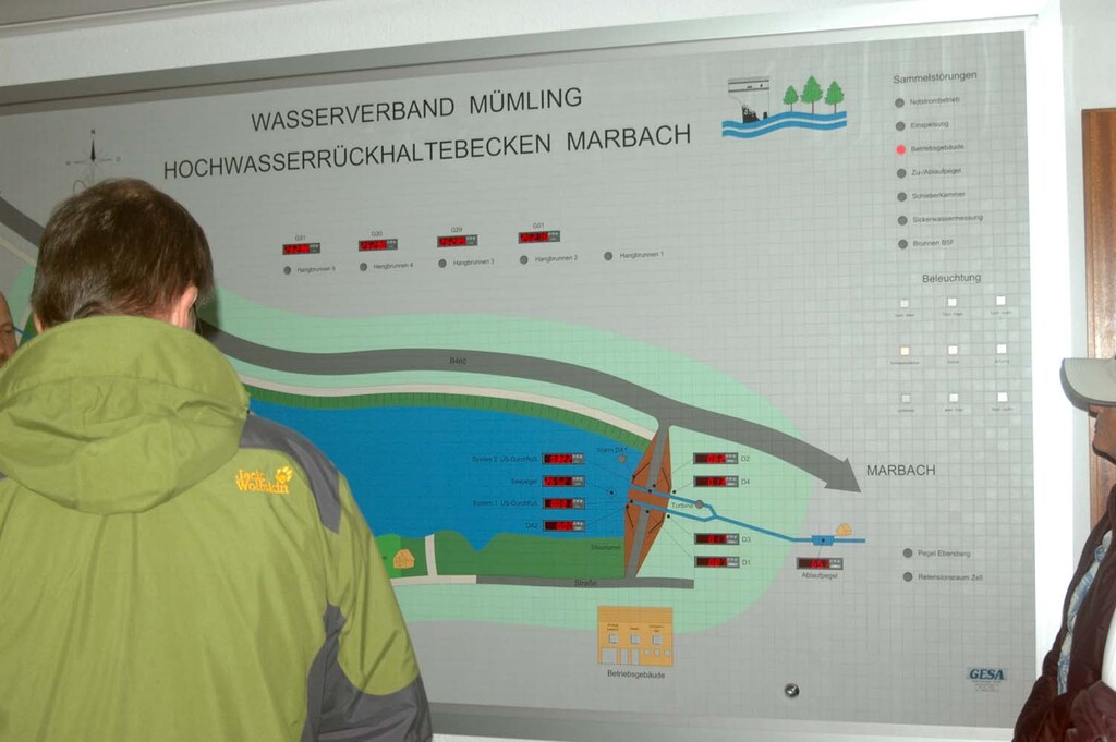 Die Pegelhöhe von 262,2 müNN wird konstant gehalten, am Nordhang wird permanent die Grundwasser-Pegelhöhe geprüft, ob sie 265 müNN beträgt. Nur so können die Druckverhältnisse sicher gehalten werden. Die Wand ist zwar dicht versiegelt, aber zu hoher Druck könnte sie zermürben. Solange der Grundwasserdruck höher ist als der Seedruck, ist dies gewährleistet. Die Gesamtfläche des Stausees beträgt 2700 Meter in der Länge und zwischen 110 und 240 Meter in der Breite. Der Ablauf beträgt mindestens 200 l / sec, maximal 3,5 Kubikmeter / sec. Steht mehr Wasser an, setzt die Rückhaltefunktion des Beckens ein. Bei einem Pegel über 266 müNN muß die Anlage 24 Stunden besetzt sein, sonst erfolgt nur Stichprobenüberwachung.