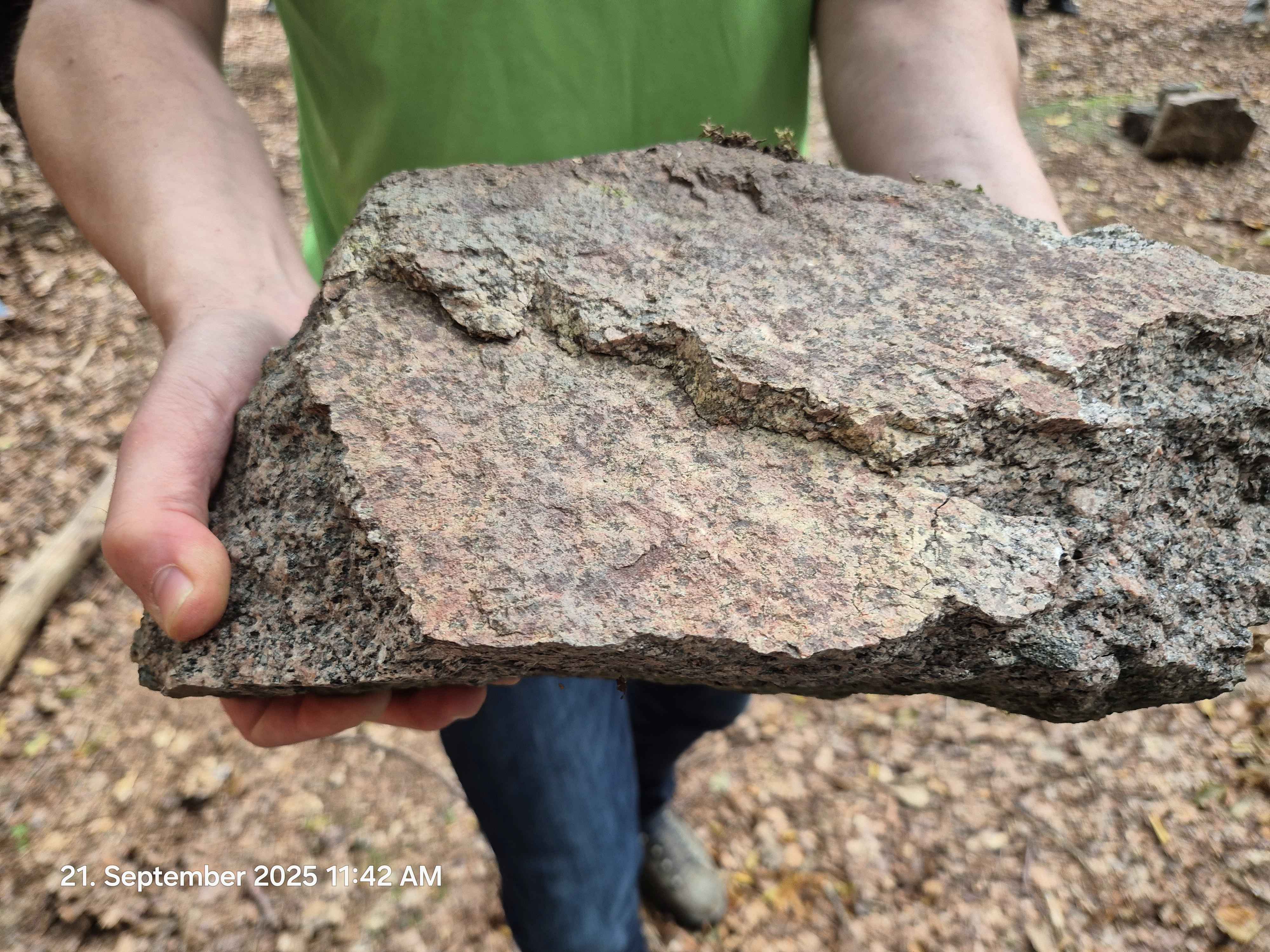 Wie nun genau der schöne Trommgranit entstanden ist, führte Jochen Babist, Fachbereichsleiter Geowissenschaften beim Geo-Naturpark, anschaulich aus. Als damals im Erdaltertum zwei Kontinente kollidierten, faltete sich in der Knautschzone ein riesiges Gebirge auf. Gleichzeitig entstanden Scherzonen, an denen eine quarzreiche Schmelze eindrang und als Trommgranit vor 339 Millionen Jahren in eine Tiefe von 18 Kilometern auskristallisierte. Der Trommgranit zeigt neben Quarz und Feldspat Kalifeldspäte, die dem Gestein seine rötliche Färbung verleihen.