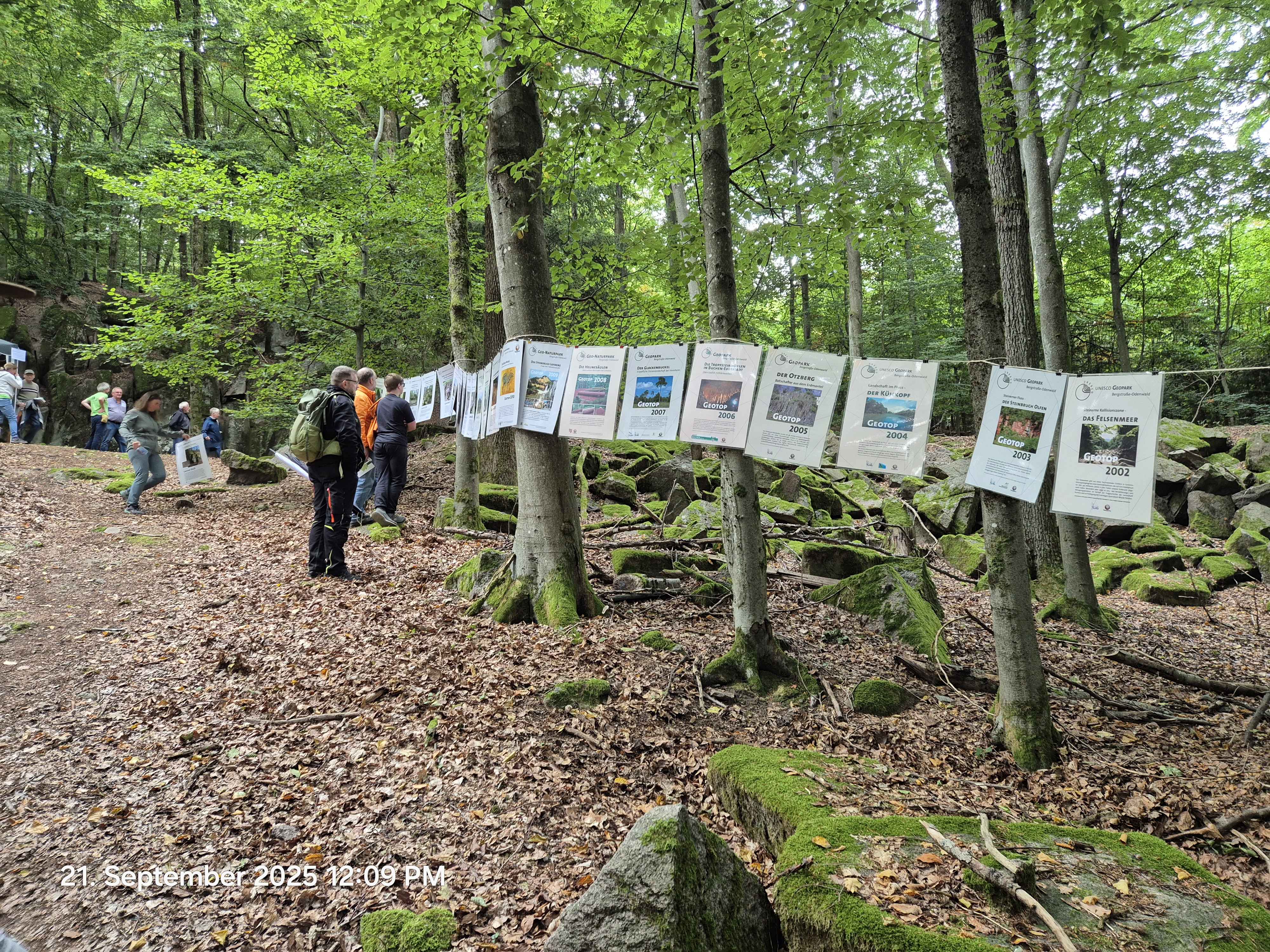 Dass es sich bei dem rötlichen Trommgranit um ein ganz besonderes Gestein handelt, zeigt sich im Steinbruch Streitsdöll eindrücklich. Als herausragendes Fenster in die Erd- und Kulturgeschichte zeichneten Geopark Geschäftsführerin Dr. Jutta Weber und Grasellenbachs Bürgermeister Markus Röth den Steinbruch am 21. September zum Geotop des Jahres 2025 aus. Über 40 Besucherinnen und Besucher lockte das Event am Sonntagmorgen zu dem wunderschönen Kleinod oberhalb von Scharbach.