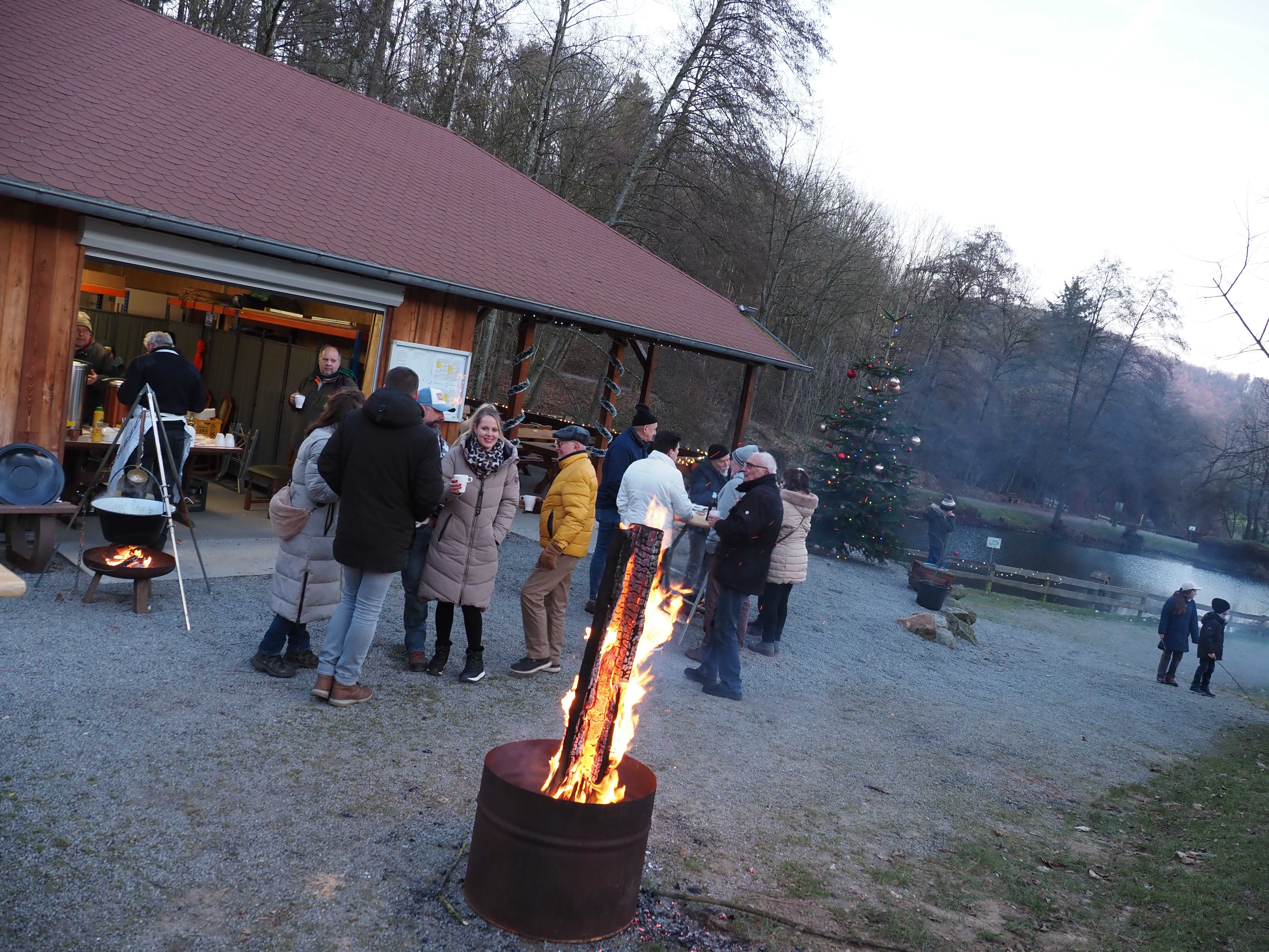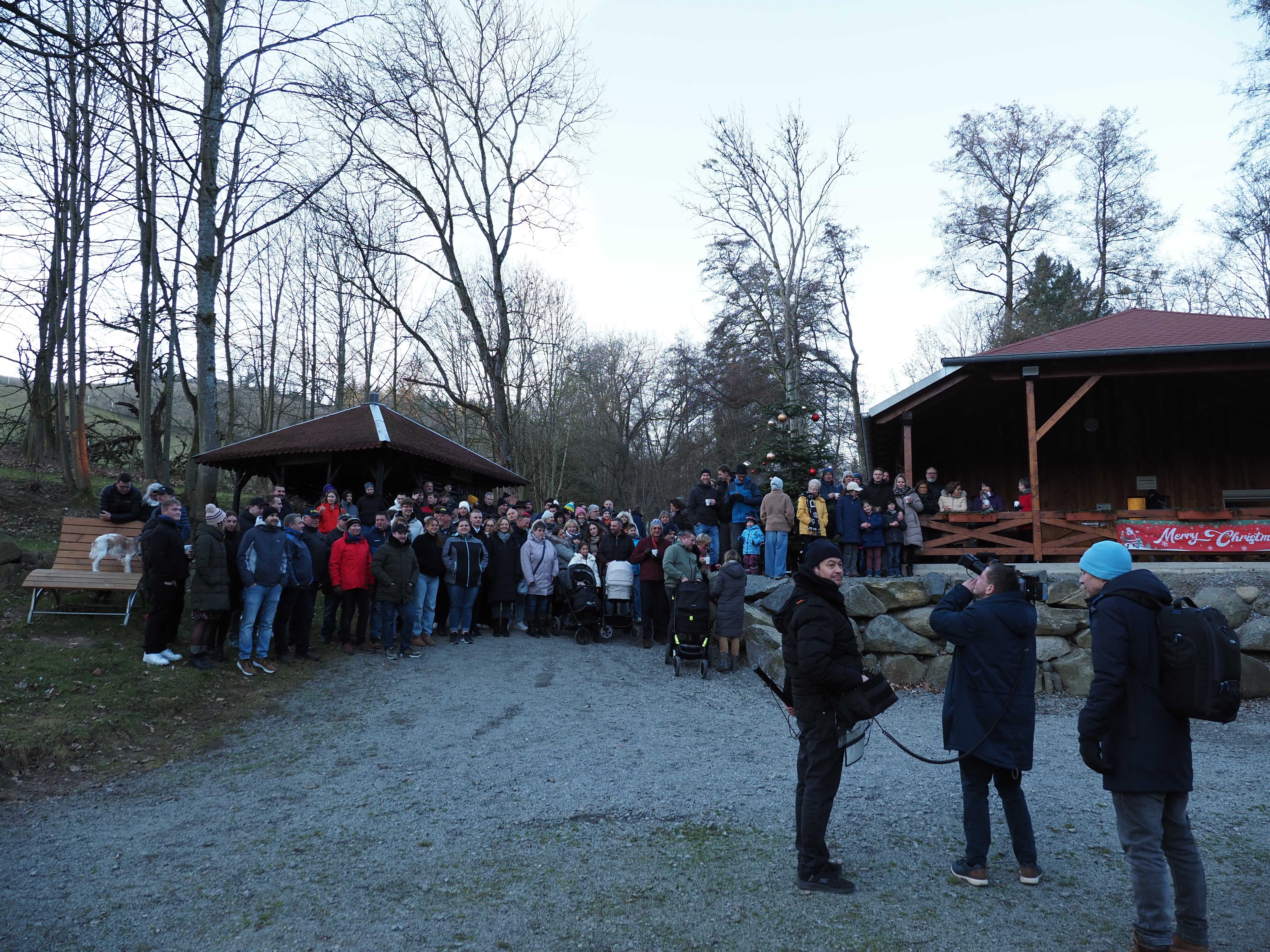 15:30 Uhr Der VVE hat zum Glühweinfest am Striethteich eingeladen. Ursprünglich sollte das Glühweinfest am Samstag, den 28.12.25 stattfinden. Das wurde anlassbedingt vorgezogen. Rund 150 Bürger von Elmshausen waren vor Ort. Alle haben sich vor der „Hütte“ aufgestellt. Gesungen wurde „O Tannenbaum“ und ein Weihnachtsgruß in die Kamera gewunken.