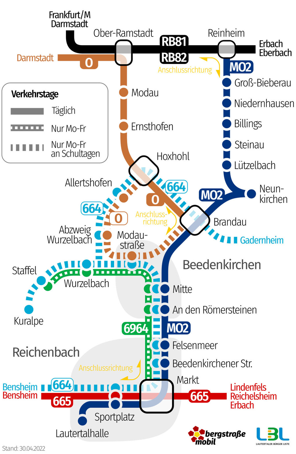 Die neue Verlängerung der Buslinie MO2 verbessert zweifellos die Mobilität in Beedenkirchen sowie in den Gemeinden Lautertal, Modautal und Fischbachtal. Am Fahrplan und an der weiteren Verkehrsentwicklung im nördlichen Lautertal sehen bergstraße.mobil und LBL allerdings noch Nachsteuerungsbedarf, damit der Umstieg auf den ÖPNV wirklich allen gelingen kann.